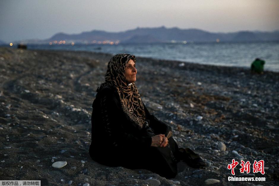 70岁的巴勒斯坦老人Amoun在希腊科斯岛的海滩上休息,双目失明的她从叙利亚的阿勒颇一路逃亡到这里。
