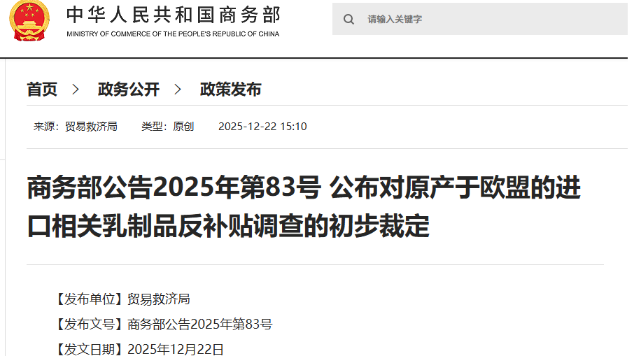 商务部22日发布了对原产于欧盟的进口相关乳制品反补贴调查初裁公告,决定自2025年12月23日起,采取临时反补贴税保证金的形式对原产于欧盟的进口相关乳制品实施临时反补贴措施。2025-12-22 16:51