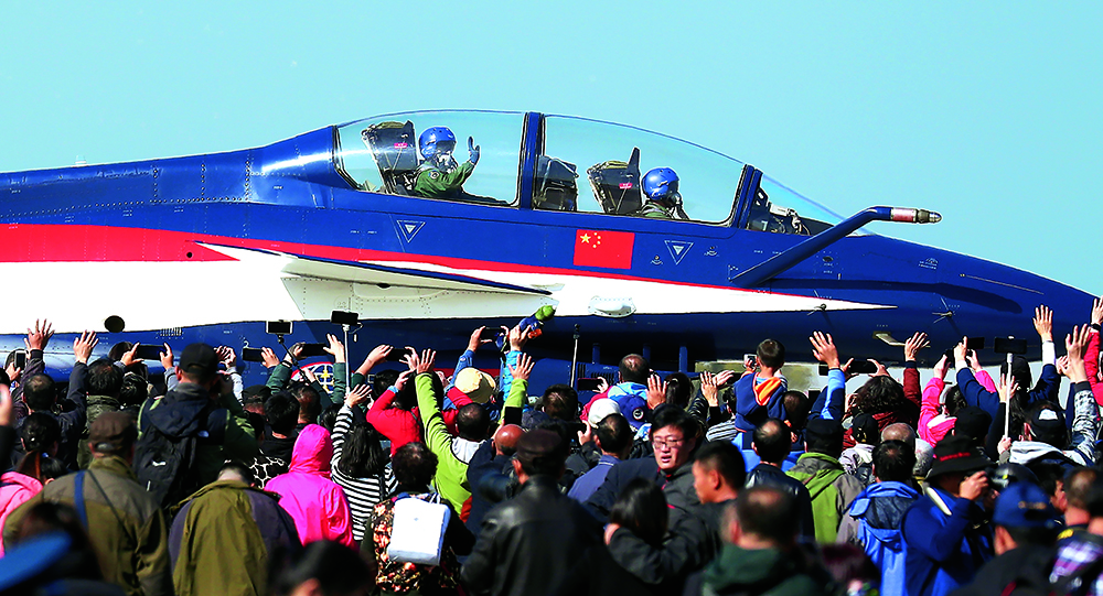 2019年10月17日,吉林省长春市,空军八一飞行表演队飞行员驾驶歼-10飞机向观众致意。当天庆祝人民空军成立70周年航空开放活动在长春开幕