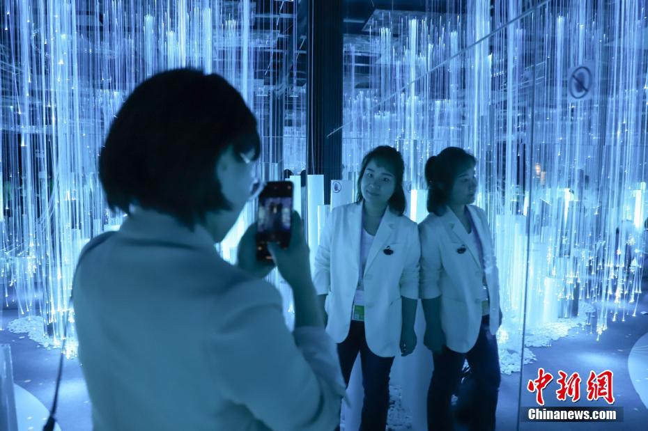 5月28日,参观者在《流动的城市》作品中拍照留影。当日,在贵阳2019中国国际大数据产业博览会期间开馆的“追梦·未来”数字艺术特展吸引众多市民前来观展。据悉,本次展览在1200平方米沉浸式的科技艺术空间内展示了以“时光秘境”“追梦之旅”“数说未来”为主题的10件大数据主题艺术作品。中新社记者 瞿宏伦 摄