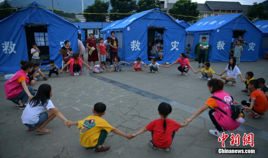 6月18日,四川省宜宾市长宁县双河镇文化广场临时安置点内,受灾民众已安置到临时搭建的救灾帐篷中。图为志愿者们与孩子们做游戏。中新社记者 刘忠俊 摄