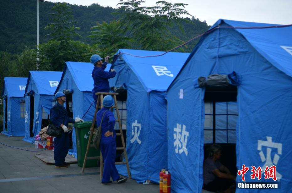 6月18日,四川省宜宾市长宁县双河镇文化广场临时安置点内,受灾民众已安置到临时搭建的救灾帐篷中。图为电力工人师傅们为帐篷区接通电源和电灯。中新社记者 刘忠俊 摄