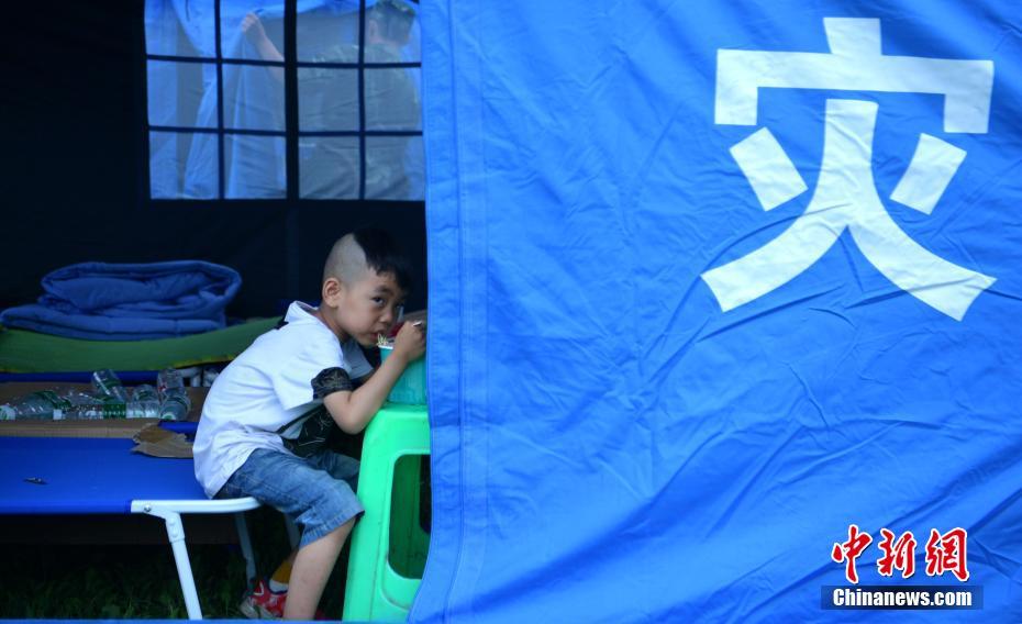 6月18日,四川省宜宾市长宁县双河镇文化广场临时安置点内,受灾民众已安置到临时搭建的救灾帐篷中。图为一名儿童在帐篷内吃饭。中新社记者 刘忠俊 摄