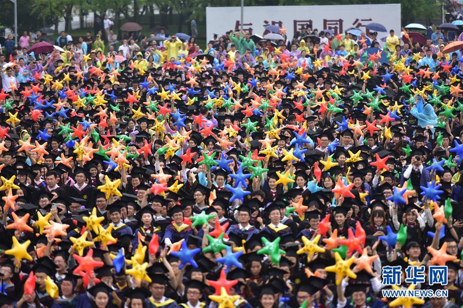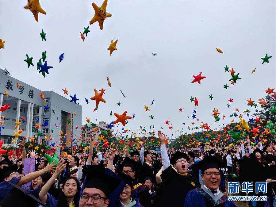 6月22日,4100余名华中农业大学毕业生手持印有“毕业啦 看我的”五色气球参加毕业典礼。新华社发(刘涛摄)