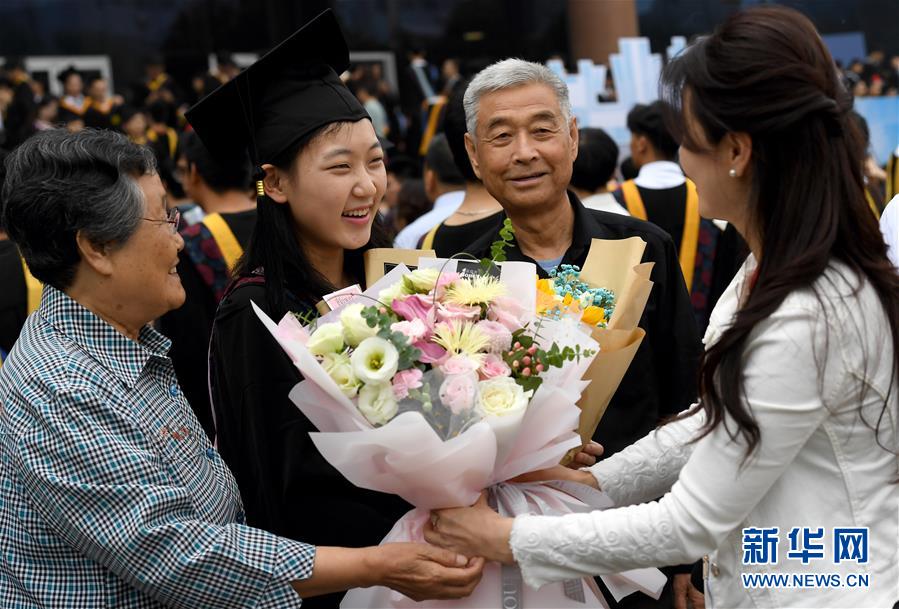 6月22日,西安交通大学第110届(2019)学生毕业典礼暨学位授予仪式结束后,家长为毕业的孩子送上鲜花祝贺。新华社记者 刘潇 摄
