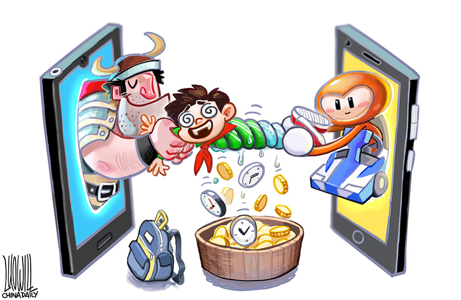 手机游戏榨取中小学生的时间与金钱。(来源:中国日报 罗杰 英文《中国日报》2019年6月26日8版)