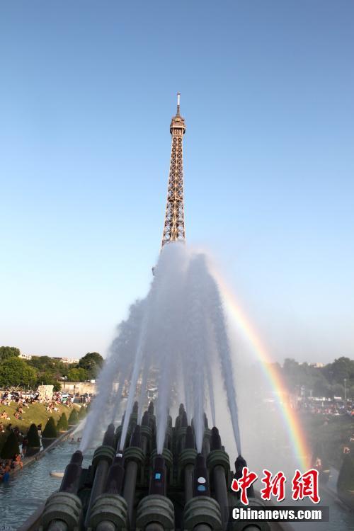 当地时间6月27日,巴黎埃菲尔铁塔对面的“华沙喷泉”完全对外开放,巨大水柱形成了一道彩虹,成为埃菲尔铁塔的靓丽风景线。法国遭遇史上罕见热浪袭击,最高气温超越历史同期。法国首都巴黎的气温居高不下,最近两天的最高气温一直在34摄氏度以上。中新社记者 李洋 摄