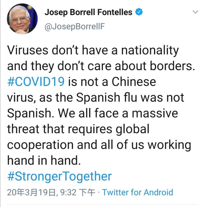 欧盟外交与安全政策高级代表 博雷利:病毒没有国籍,也没有边界。新型冠状病毒(COVID19)不是“中国病毒”,就如同“西班牙流感”,它并不是西班牙的流感。我们共同面对巨大的威胁,需要全球合作,所有人共同携手应对。
