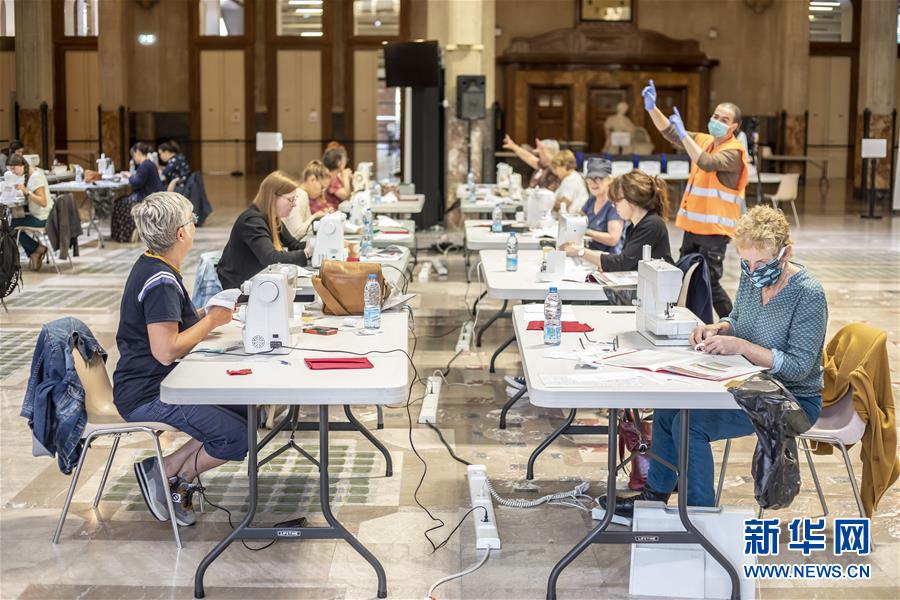 4月23日,志愿者在法国里尔市政厅改造的临时厂房内制作口罩。 法国北部城市里尔的市政厅从本周开始变身临时口罩生产车间,60多名志愿者在此制造口罩。 新华社发(塞巴斯蒂安·库尔吉摄)
