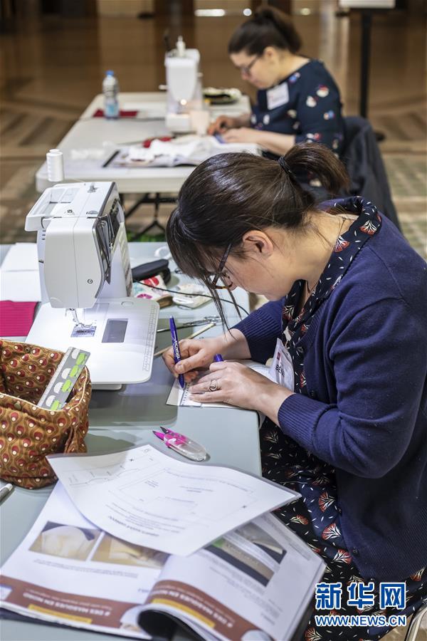 4月23日,志愿者在法国里尔市政厅改造的临时厂房内制作口罩。 法国北部城市里尔的市政厅从本周开始变身临时口罩生产车间,60多名志愿者在此制造口罩。 新华社发(塞巴斯蒂安·库尔吉摄)