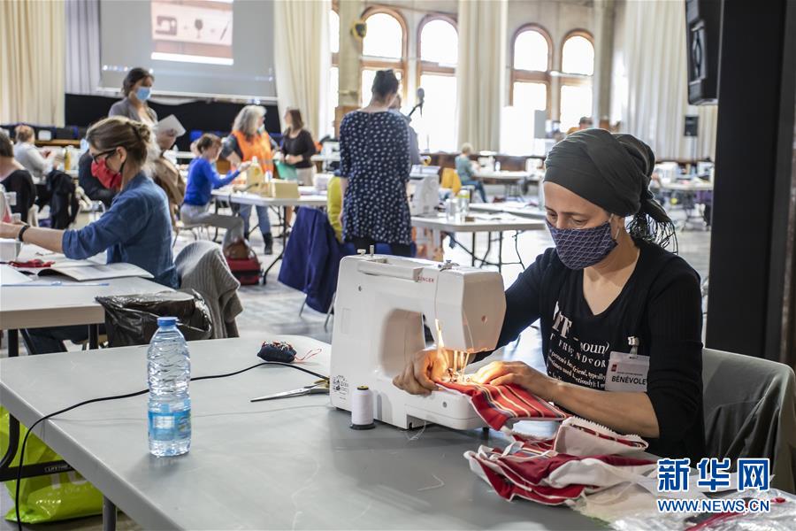 4月23日,志愿者在法国里尔市政厅改造的临时厂房内制作口罩。 法国北部城市里尔的市政厅从本周开始变身临时口罩生产车间,60多名志愿者在此制造口罩。 新华社发(塞巴斯蒂安·库尔吉摄)