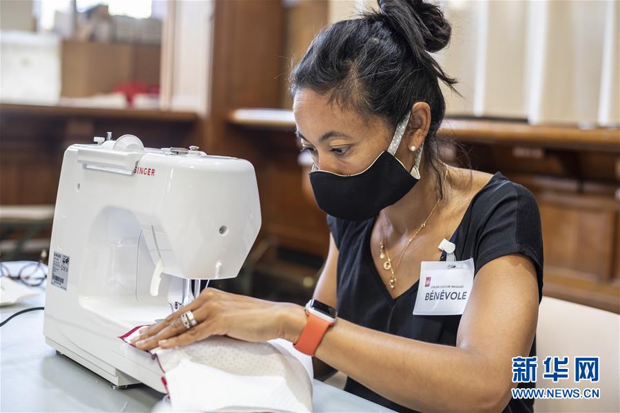 4月23日,志愿者在法国里尔市政厅改造的临时厂房内制作口罩。 法国北部城市里尔的市政厅从本周开始变身临时口罩生产车间,60多名志愿者在此制造口罩。 新华社发(塞巴斯蒂安·库尔吉摄)
