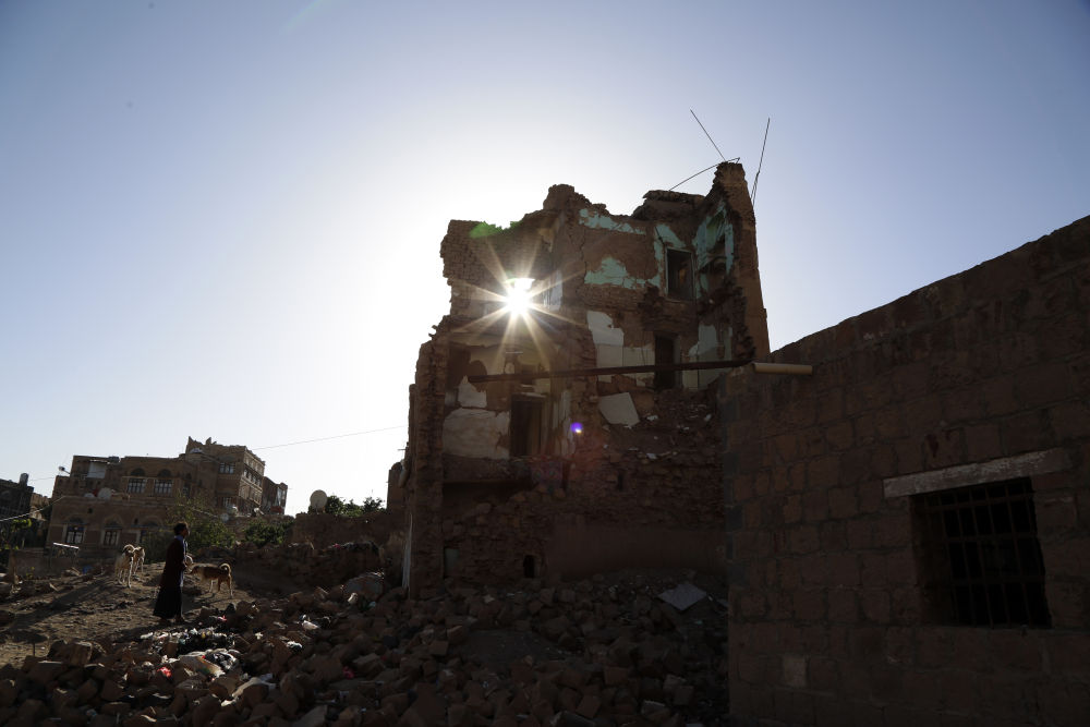 这是4月9日在也门首都萨那拍摄的一处空袭后的建筑废墟。(新华社发)