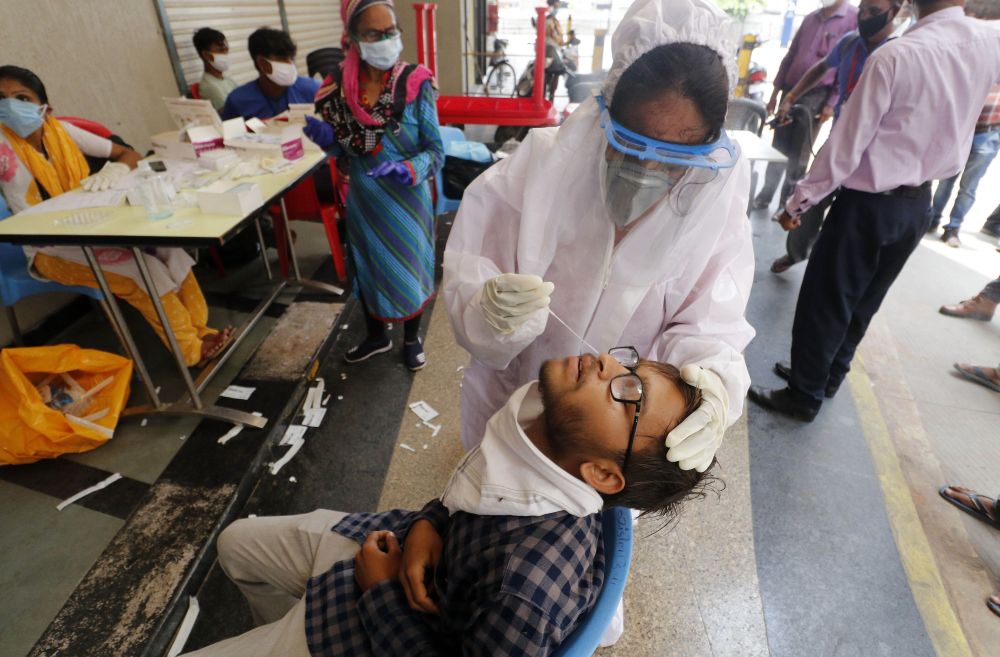 图为7月14日,医务人员在印度艾哈迈达巴德为居民进行新冠病毒检测取样。(新华社发)