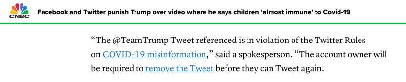 8月5日,特朗普在脸书和推特平台上分享了一段“儿童几乎对病毒免疫”的视频。但很快,脸书和推特公司就以“发布虚假信息规定”为由移除了该视频。推特公司还要求特朗普竞选团队移除这条含有新冠病毒错误信息的推文,否则无法发布新推文。