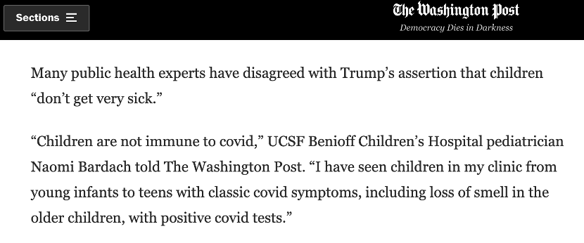 许多公共卫生专家和医学教授表示,特朗普关于“儿童免疫”的断言完全错误。