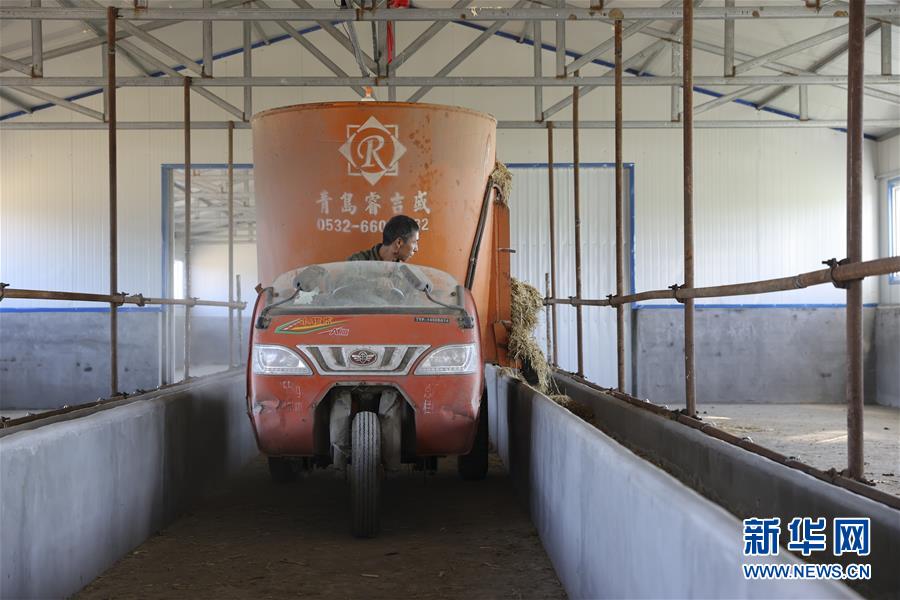8月20日,在富锦市向阳川镇东兴村锦东畜禽养殖合作社内,工人在给牛准备饲料。 近年来,黑龙江省富锦市向阳川镇东兴村引进黄牛养殖项目,采取“支部+合作社+村集体+农户+贫困户”的模式,带动向阳川镇173户贫困户入股合作社,增加贫困户收入,促进村民增收。 新华社发(张涛 摄)