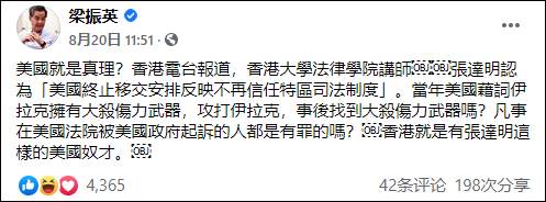 身为港大法律学院讲师,却积极为美国的无理举动开脱。全国政协副主席、香港特区前行政长官梁振英当天在脸书痛斥称,香港就是有“这样的美国奴才”。
