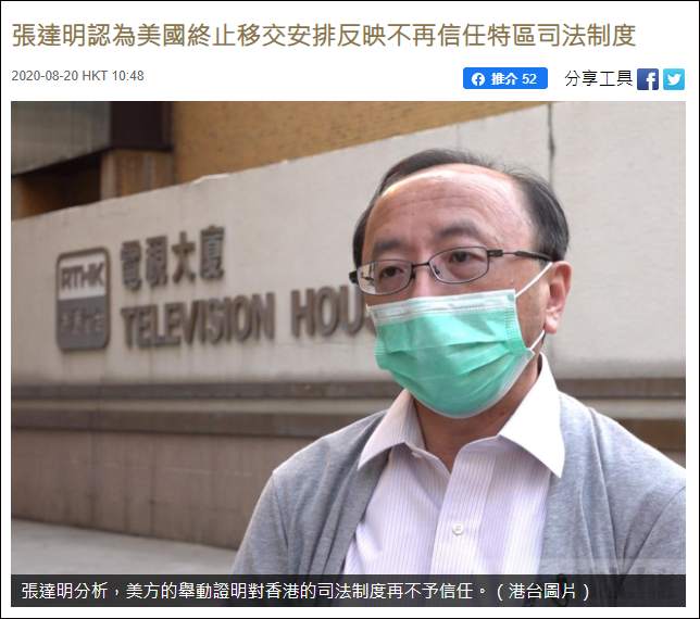 8月20日,香港法律学者、香港大学法律学院首席讲师张达明接受香港电台采访时,公然渲染“受害者有罪论”。他宣称,美国此举证明对香港的司法制度“再不予信任”。随后更是危言耸听,声称香港国安法使一些国家“不再信任香港可以维持‘一国两制’”,“变相令香港成为逃犯天堂”,打击香港国际形象。