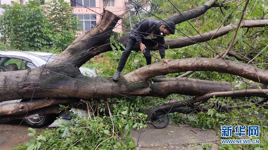 9月2日,在印度班加罗尔,一名男子从倾倒的大树上爬过。 印度每年6月至9月是季风雨季。 新华社发