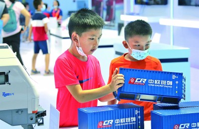 小观众在服贸会综合展区参观中欧班列模型。新华社发
