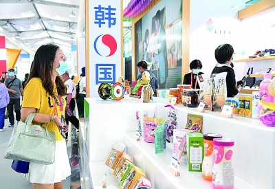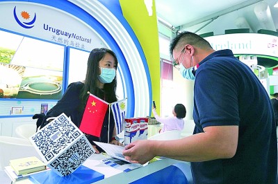 服贸会乌拉圭展位的工作人员(左)与参观者交谈。新华社发