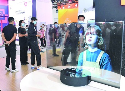 观众在服贸会综合展区参观“透明电视”。新华社发