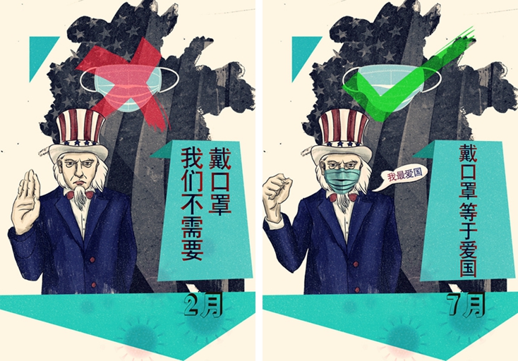2月,新冠病毒在美国传播时,美国政府表态称健康人不用戴口罩。美国总统也一直拒绝戴口罩。但7月,美国总统转而承认,无论人们喜欢与否,口罩对控制疫情传播有作用,并称戴口罩是“爱国”行为。