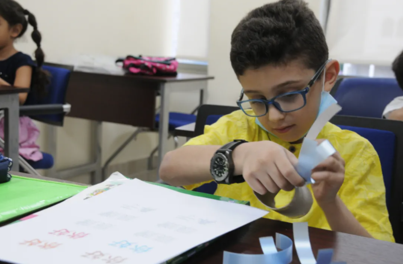 9月30日,阿克萨的弟弟在约旦安曼TAG孔子学院课堂学习制作灯笼。新华社记者冀泽摄