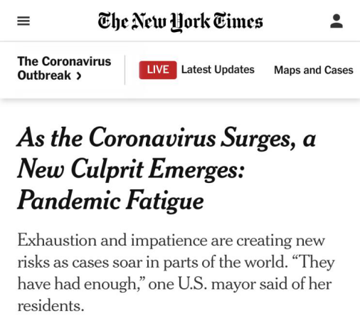 △《纽约时报》报道,抗疫疲劳是新冠感染率激增新的“罪魁祸首”