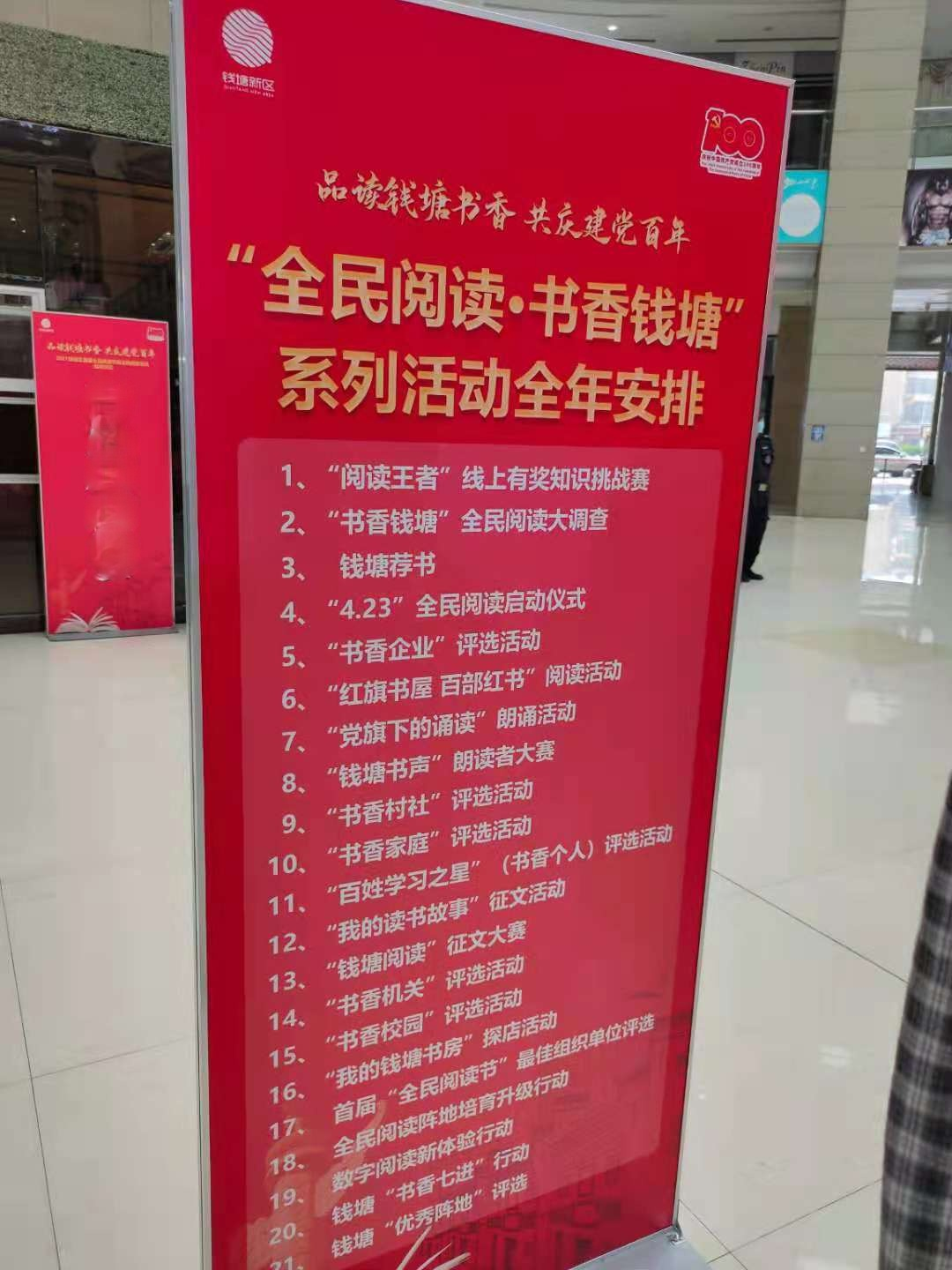 4月23日,第二十六个世界读书日,品读钱塘书香2021杭州市钱塘区首届全民阅读节暨全民阅读活动启动仪式在义蓬购物中心举行,营造全民阅读的书香氛围,丰富多彩的系列全民阅读活动将贯穿全年,以此引导市民一起探寻书中的乐趣,让全民阅读在全区遍地开花,浸润钱塘书香。