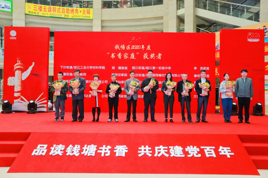 仪式当天,对2020年“书香系列”先进集体和家庭进行了表彰,为10家年度杭州市钱塘区“书香家庭”颁奖。手捧鲜花和获奖证书的书香家庭代表从藏书选择、自身阅读时间规划、培养孩子阅读习惯等方面,为现场观众分享了其独到的经验。书香家庭代表向市民发出倡议,把阅读做进计划里,每天读书一小时,和身边的人一起读,让阅读成为一种生活习惯。