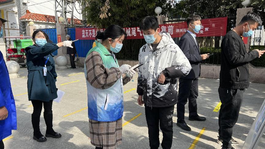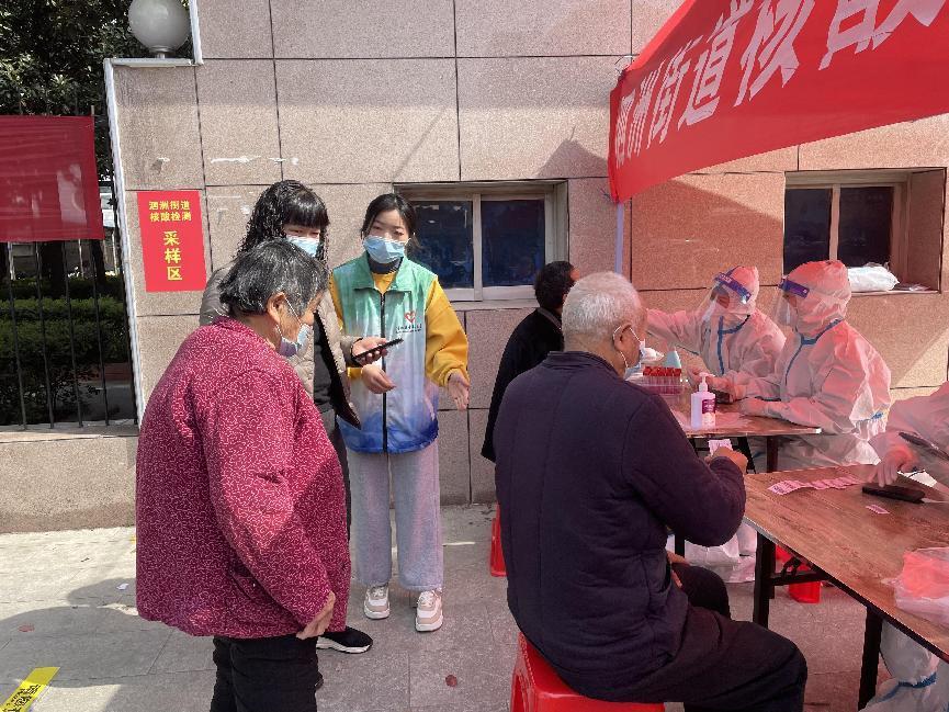 当日早晨,百余名青年志愿者在泗洲街道办事处集合,进行针对性志愿服务培训,并分配至不同的核酸检测点,主要负责现场秩序维护、测量体温和核酸检测人员的信息登记等工作。面对老年人没有智能手机扫码查验的情况,青年志愿者们耐心帮助老人群体完成信息检验和登记工作,在维护现场秩序的同时,还为儿童、残障人士等特殊群体提供暖心服务。