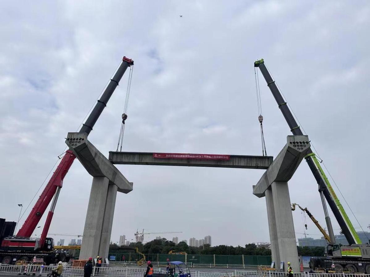 12月2日,中国十九冶承建的绿云路(凤林西路以北-329国道)智慧快速路工程Ⅱ标段项目顺利完成首片预制箱梁的架设工作。