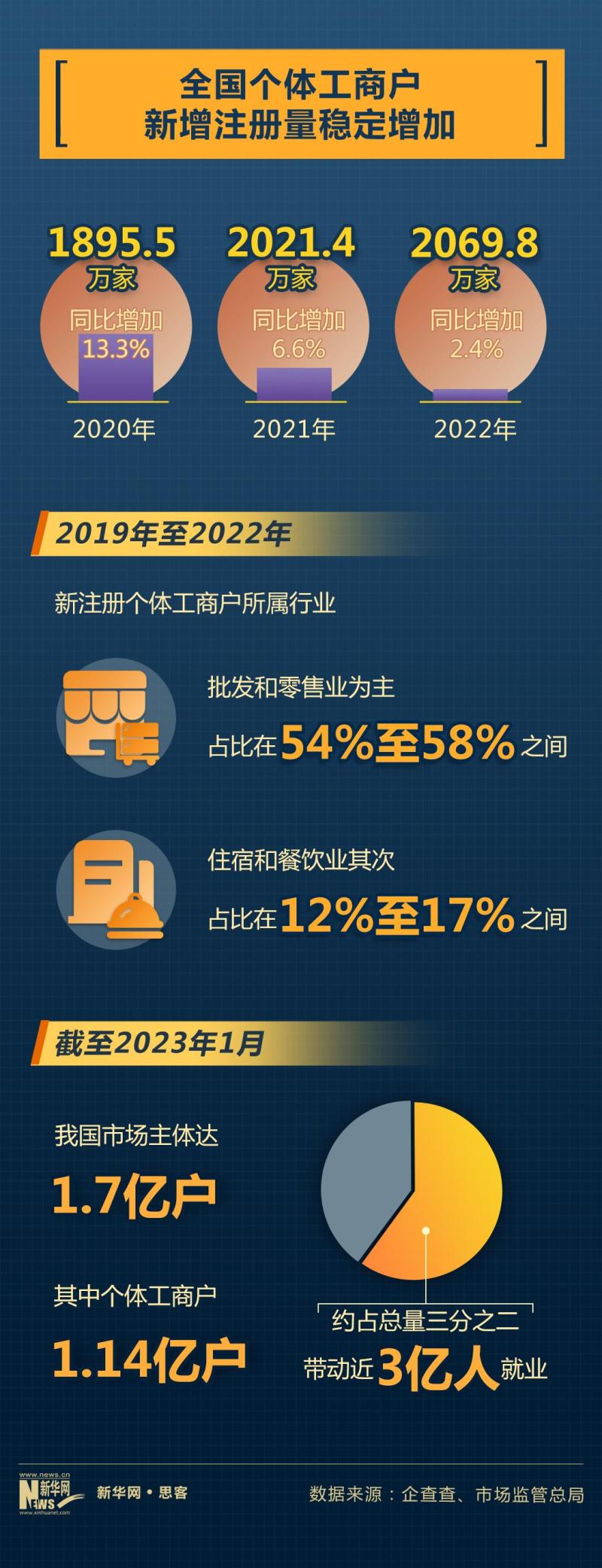 近日市场监管总局统计显示,截至2023年1月,我国市场主体达1.7亿户,其中个体工商户1.14亿户,约占总量三分之二,带动近3亿人就业。