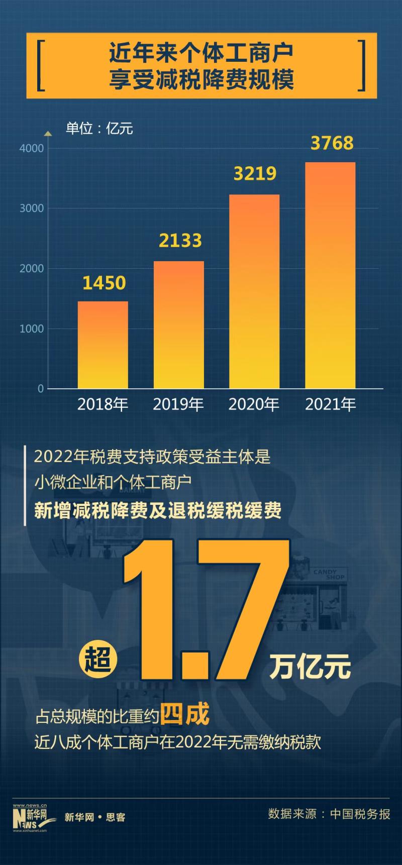 据了解,在2022年的税费支持政策中,最为受益的主体是小微企业和个体工商户,新增减税降费及退税缓税缓费超1.7万亿元,占总规模的比重约四成;另外,近八成个体工商户在2022年无需缴纳税款。从各行业情况看,制造业新增减税降费及退税缓税缓费近1.5万亿元,占比35%左右,是受益最明显的行业。