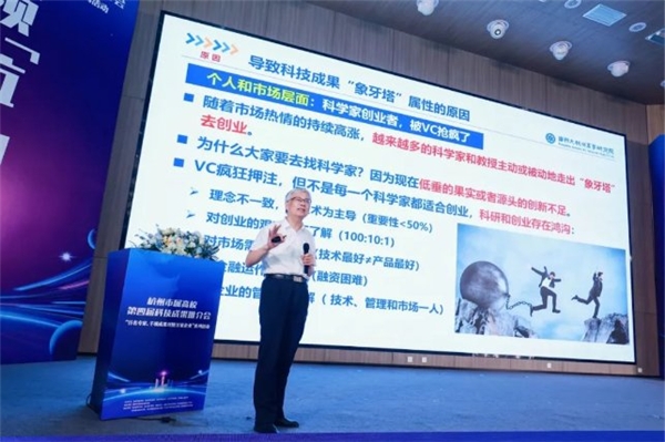 王建宇在主题报告中指出,高校科技成果转化存在转化率低、转化周期长、转化价值低及制度层面的问题,高校应当充分认识到转化方式已发生变迁,要用足用好国家、省市层面的政策优势,构建各要素高效配置的科技转化平台,完善科技成果评价机制才能让科技成果走出“象牙塔”。过去三年,杭高院在科研、人才和成果转移转化方面实现较快突破,探索走出了一条新型科研机构的创新发展道路,出台一系列更加灵活的制度,鼓励科研人员带着科研成果走出“象牙塔”,营造创新创业教育文化;搭建“引进来、走出去”的科技成果转化平台,联合成立院企技术创新平台,依托HIAS科创园,输出有针对性的全要素科技解决方案。该报告引起现场高校、企业嘉宾热烈反响。