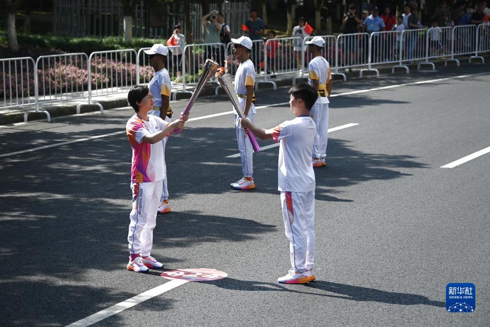 9月9日,火炬手钱智权(右)和张珊在火炬传递中。新华社记者 孙非 摄