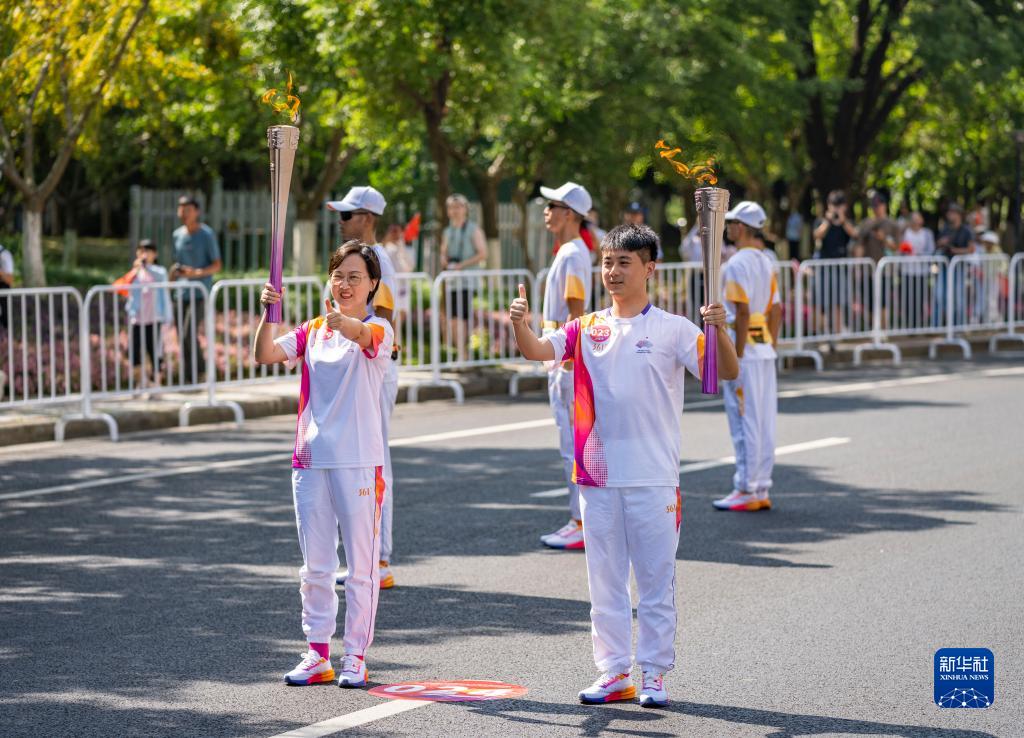 9月9日,火炬手钱智权(右)和张珊在火炬传递中。新华社记者 徐昱 摄