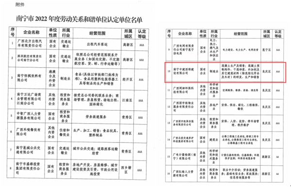 近日,南宁市人社局、市总工会、市企联、市工商联四部门联合发文公布了2022年度南宁市劳动关系和谐单位名单,南宁中建西部建设有限公司被认定为2022年度南宁市AAA级劳动关系和谐单位。