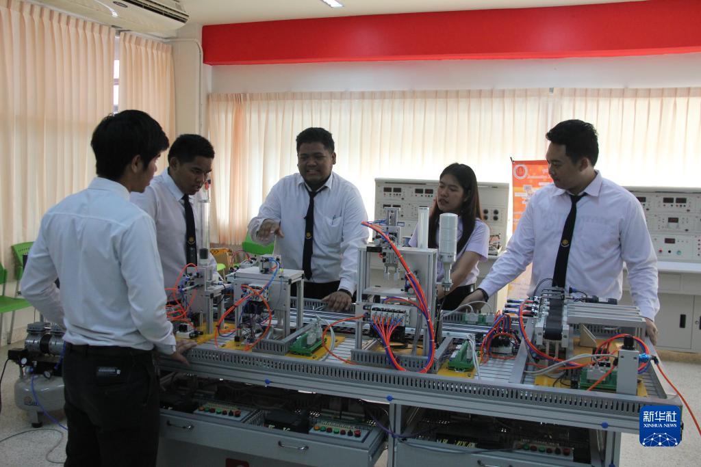 2019年2月20日,学生们在泰国大城技术学院内的鲁班工坊讨论学习。