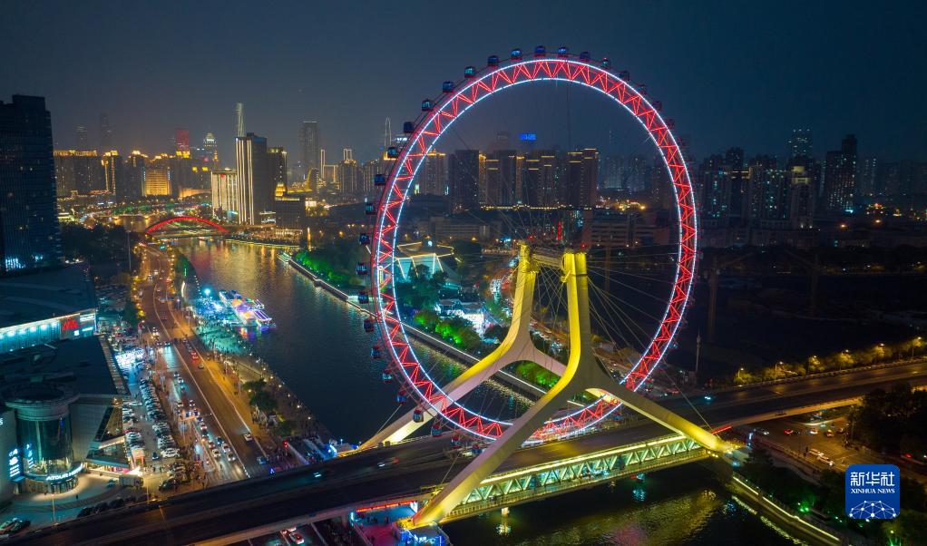 这是4月27日晚拍摄的“天津之眼”摩天轮夜景(无人机照片)。