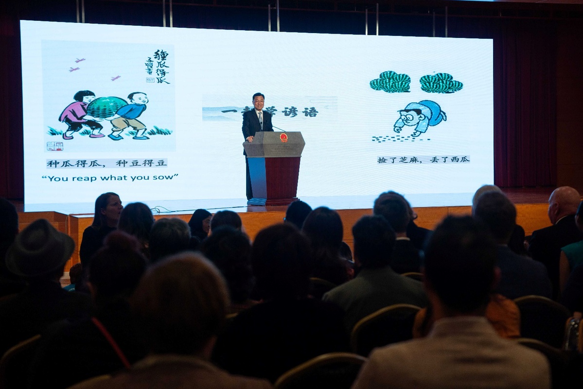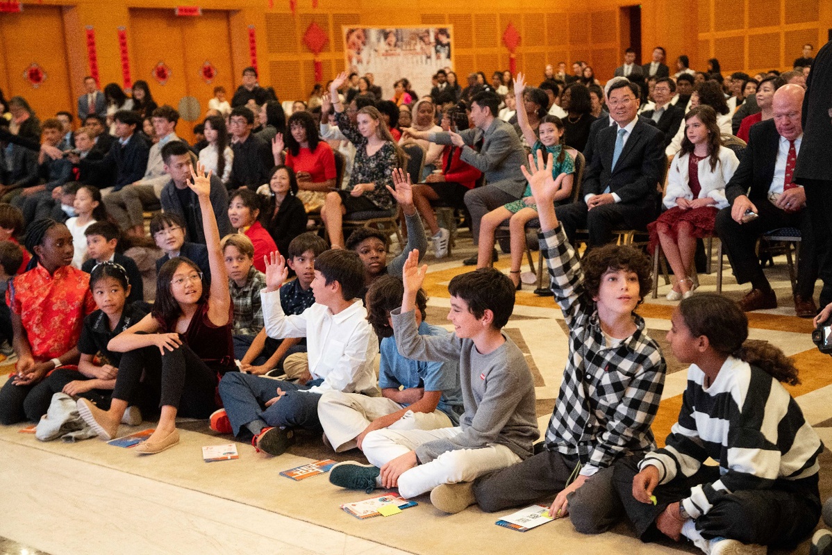 谢锋与在场美国中小学生亲切互动,猜字谜、解成语、品谚语,共同领略中文的独特魅力。谢锋说,浩如烟海的汉字是中华文明的基因,言简意赅的成语是中国文化的结晶,风趣生动的谚语是民间智慧的闪光。中文是世界上唯一活着的象形文字,每个汉字都像一位朋友,每个汉字都会“说话”。谢锋拆解“人”“信”“武”等汉字,生动展现中国人合作共赢的人生观、重信守诺的价值观、以和为贵的世界观;解读“三人成虎”“水滴石穿”“同舟共济”等成语,深刻阐释处理中美关系也要汲取历史智慧,防止三人成虎的错误认知,坚持水滴石穿的不懈努力,秉持同舟共济的伙伴精神,逐步找到中美新时期正确相处之道;指出中英文不少谚语都有异曲同工之妙,再次证明中美两国人民都是富有智慧的人民,中西方文化有差异也有相通。生动形象的字谜让美国小朋友兴致盎然、踊跃答问,妙趣横生的歇后语让现场笑声不断、掌声频频,借成语故事寓中美关系,既让观众会心一笑,又发人深省。