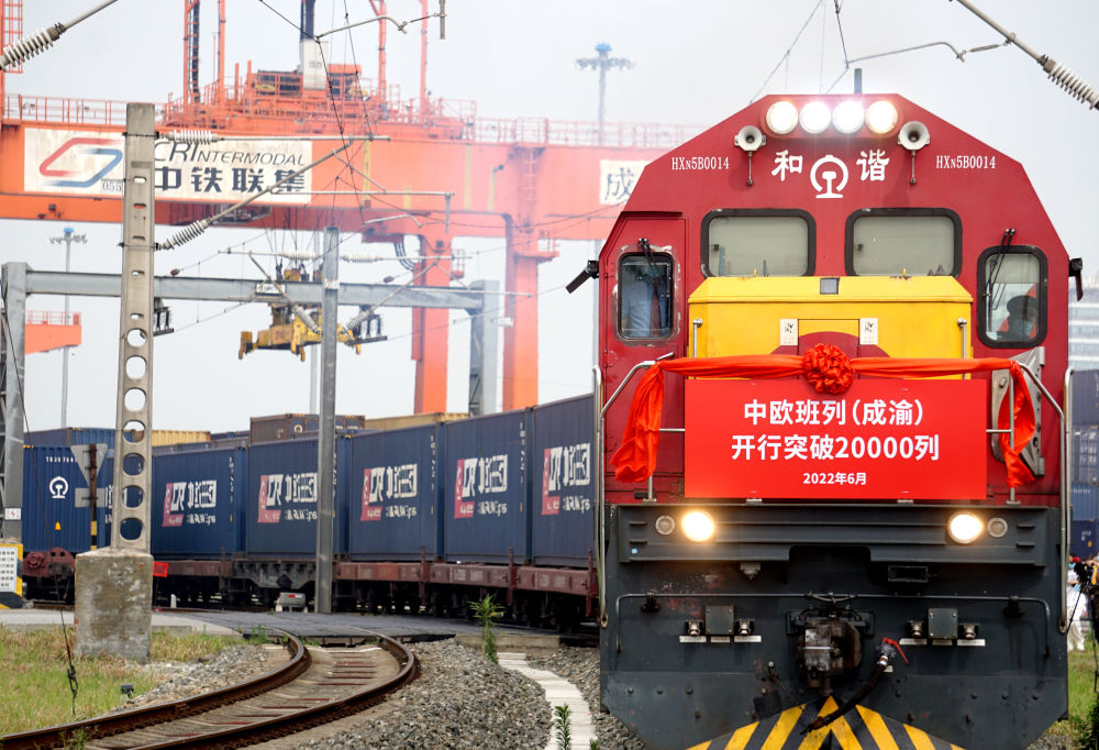 ↑图为第七届中国图片大赛获奖作品《中欧班列(成渝)开行量突破20000列》。胡志强 摄