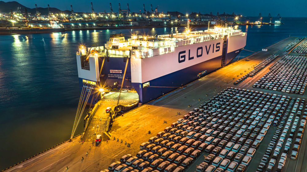 ↑图为第七届中国图片大赛获奖作品《以车为媒 描绘“海上丝路”发展美景》。宋林继 摄