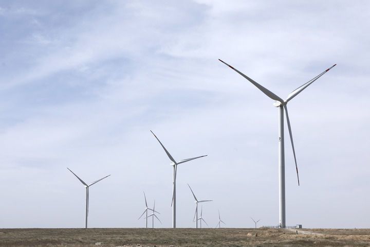 这是2023年4月3日在哈萨克斯坦札纳塔斯拍摄的札纳塔斯100兆瓦风电项目风机。