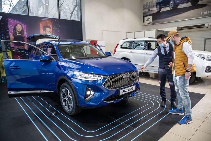 2021年4月1日,销售人员在哈萨克斯坦阿拉木图市经销商店向消费者介绍哈弗汽车。