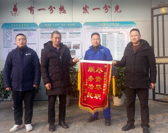 近日,国网蒲江县供电公司朝阳供电服务站连续收到鹤山街道西河村委会、村民送来的“电网建设造福村民”、“和谐电力卫士、保驾护航后盾”、“尽责尽职、服务为民”三面锦旗,以表对国网蒲江县供电公司朝阳供电服务站及时帮助村企业和果农灌溉解决用电问题,并特别对相关客户经理兢兢业业的工作态度及热情周到的服务表示充分肯定和感谢。