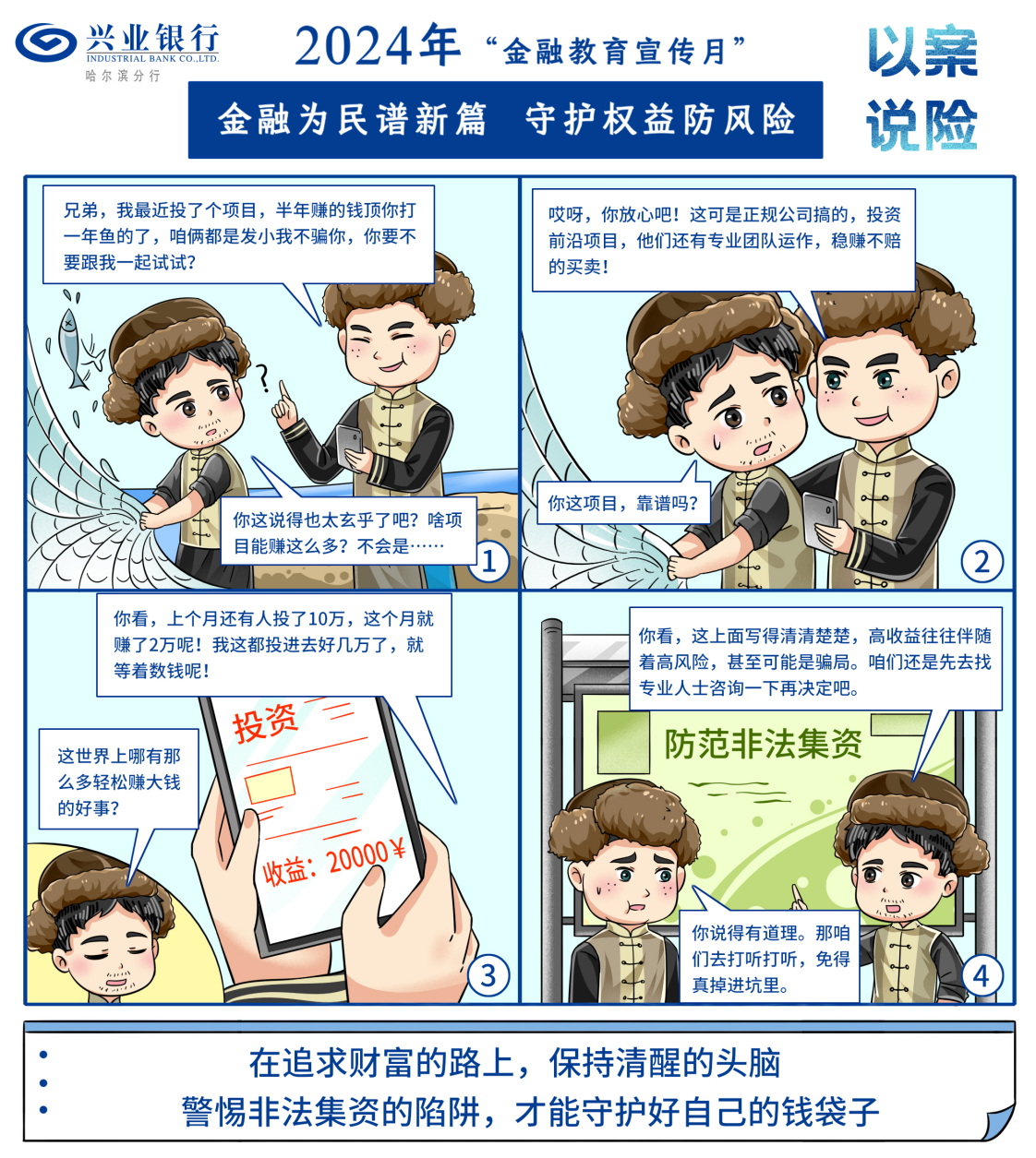 “拒绝高利诱惑,远离非法集资。”兴业银行哈尔滨分行积极开展2024年“金融教育宣传月”活动,聚焦少数民族地区消费者金融素养提升,提高防范非法集资能力。温馨提示您:天上不会掉馅饼,高息回报是陷阱,投资理财别轻信,多方咨询再决定。