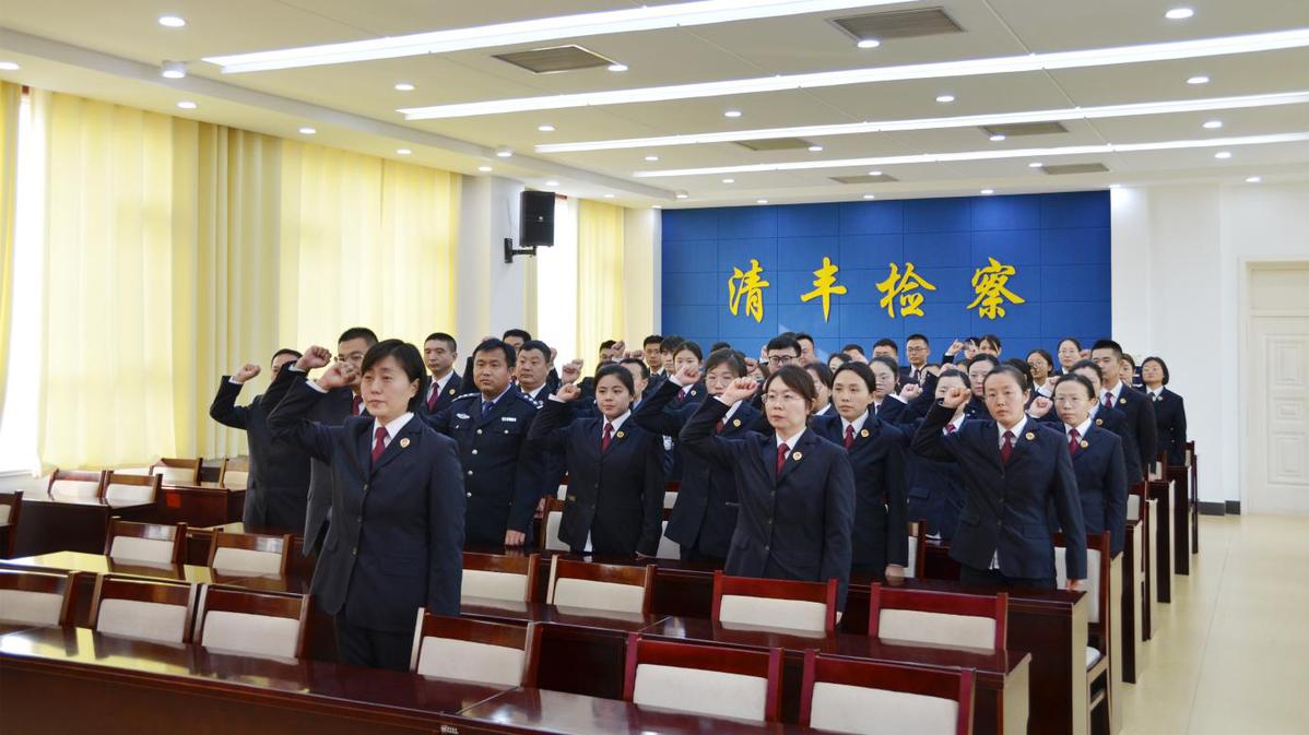 仪式开始后,全体检察干警齐唱国歌。院党组成员、副检察长齐丽领读誓词,全体干警整齐列队,高举右拳,面向国徽庄严宣誓。